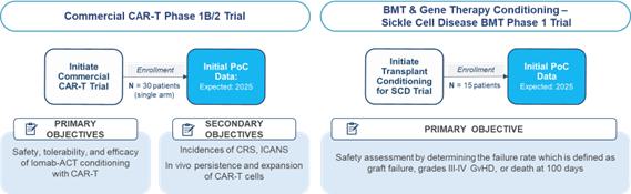 Iomab-ACT is our next-generation targeted conditioning agent directed against CD45, a target expressed widely across the hematopoietic system including normal nucleated immune cells such as lymphocytes that is relevant to this program and uses the Iodine-131(“I-131") radioisotope payload. We are developing Iomab-ACT for cell and gene therapies for both malignant and non-malignant hematologic indications. Iomab-ACT utilizes non-myeloablative doses of I-131, to not fully deplete the patient’s bone marrow and immune system with the goal of improving patient access and outcomes for potentially curative cell and gene therapies by replacing the need for the non-targeted, chemotherapy-based conditioning regimens that are currently used. Iomab-ACT is currently being studied in three clinical trials. These trials include Iomab-ACT with a commercial CAR-T therapy, Iomab-ACT prior to allogeneic BMT for patients with SCD, which could potentially inform a trial design with gene therapy for SCD, and Iomab-ACT with a novel investigational CD19 CAR-T therapy.