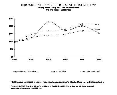 On February 14, 2005, the Company, through its European subsidiary Alamo Group (EUR) Ltd., acquired 100% of the issued and outstanding stock of Spearhead Machinery Limited (Spearhead). Spearheadmanufacturers a range of tractor-mounted vegetation maintenance equipment, including reach mowers, flail mowers and rotary cutters. The purchase price was $6.0 million which included goodwill of $4.2 million. The acquisition was accounted for under the purchase method and the results of operations have been included in the Companys Statement of Income from February 14, 2005.