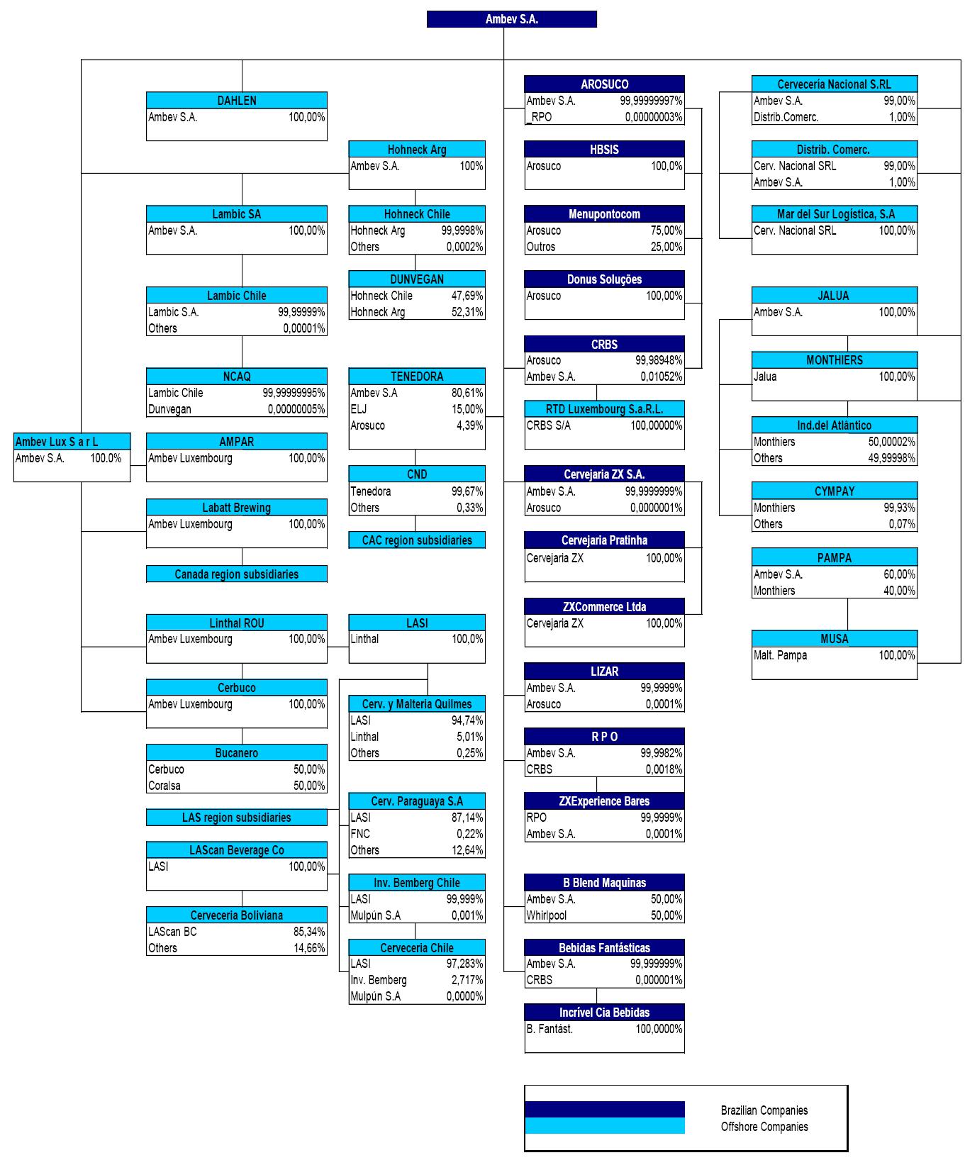 In this annual report, except as otherwise indicated or as the context otherwise requires, the “Company,” “Ambev,” “we,” “us” and “our” refers to Ambev S.A. and its subsidiaries and, unless the context otherwise requires, the predecessor companies that have been merged out of existence with and into it. All references to “Old Ambev” refer to Companhia de Bebidas das Américas – Ambev, our former subsidiary that had common and preferred shares listed on the São Paulo Stock, Commodities and Futures Exchange (B3 S.A. – Brasil, Bolsa, Balcão), or the B3 (previously named as BM&FBovespa S.A. – Bolsa de Valores, Mercadorias e Futuros), and common and preferred ADSs listed on the New York Stock Exchange, or the NYSE, and that was merged out of existence with and into us in January 2014. All references to NAB are to the non-alcoholic beverages in our portfolio other than non-alcoholic beer. All references to “Brazil” are to the Federative Republic of Brazil, unless the context otherwise requires. All references to the “Brazilian government” are to the federal government of Brazil. All references to percent ownership interests in Ambev do not take into account treasury shares.