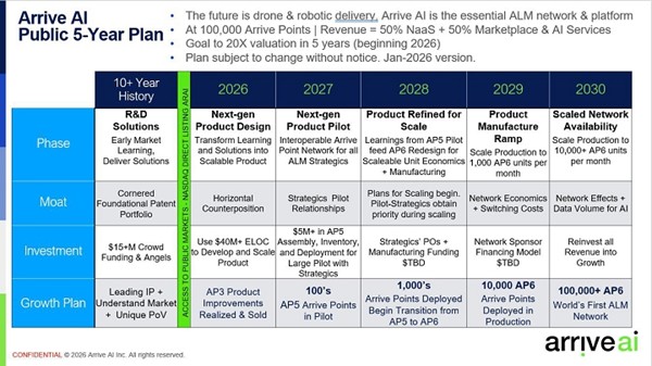 The future of last-mile delivery belongs to drones and robots. Arrive AI is building the essential ALM network and platform to enable this transformation. Our five-year plan targets deployment of 100,000 Arrive Points, achieving a revenue model of approximately 50% Network-as-a-Service and 50% Marketplace & AI Services.