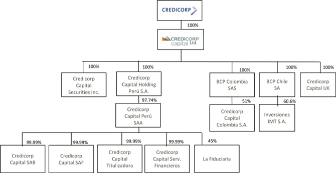 On February 3, 2015, Credicorp, through its subsidiary Grupo Crédito, has agreed to undertake a reorganization whereby it will transfer an equity block to Credicorp Capital Holding Perú S.A., a subsidiary of Credicorp Capital Ltd., with the aim of implementing a reorganization of Credicorp’s investments. The equity block is composed of the investment that Grupo Crédito held in Credicorp Capital Peru, whose net equity is approximately S/.511.3 million as of December 31, 2014. As a result, Grupo Crédito will reduce its share capital in approximately S/.491.7 million and its "unrealized results" in approximately S/.19.6 million. Credicorp Capital Holding Peru also will increase its share capital in about S/.491.7 million and its "unrealized results" in approximately S/.19.6 million. In this regard, it will issue 491,686,830 new shares with a nominal value of S/.1.00 each shareholder in favour of Credicorp Ltd (shareholder of Grupo Crédito).