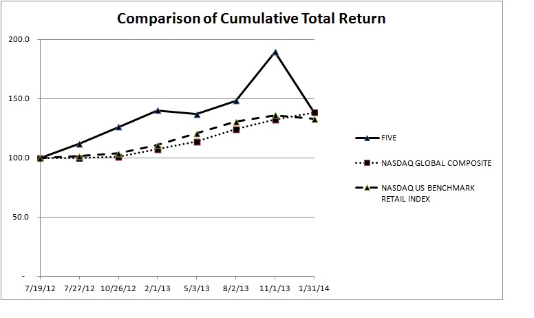 Separation and General Release Agreement, dated August 6, 2013, by and between David Johnston and Five Below, Inc. (incorporated by reference to Exhibit 10.1 to the Current Report on Form 8-K filed with the Commission on August 6, 2013)