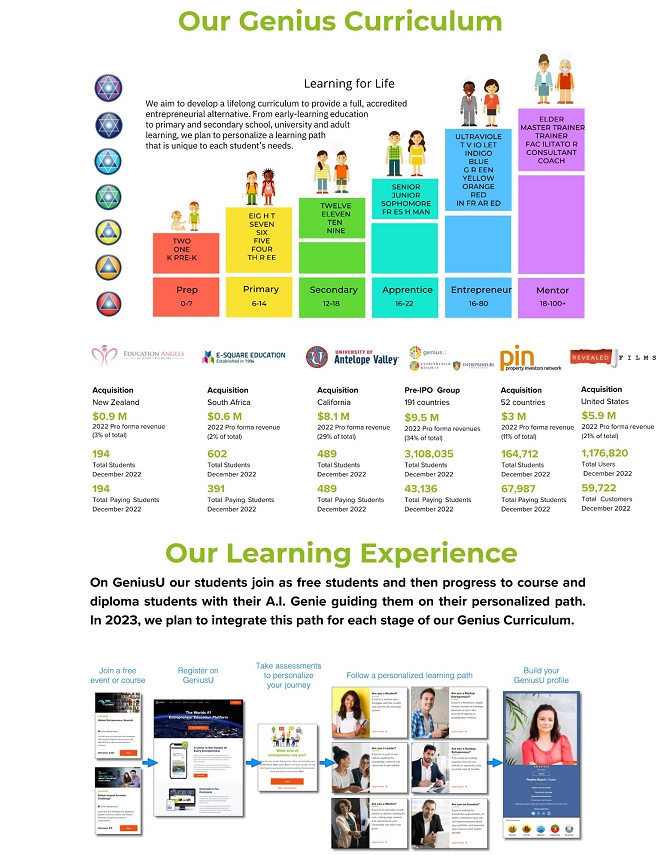 Genius Group (or the Group) refers to the entire group of companies within Genius Group, which include the four companies in the Pre-IPO Group and, following the closing of their acquisitions, the five Acquisitions as defined below.
