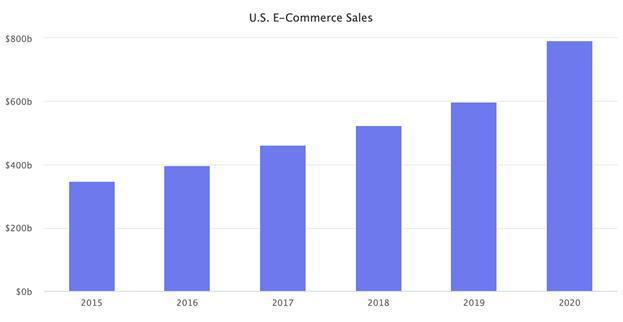 According to Marketplace Pulse, U.S. e-commerce grew 32% in 2020 to reach $790 billion, up from $598 billion the year before. According to the Department of Commerce, e-commerce represented 14% of total retail spending, a significant increase from 11.3% in 2019.