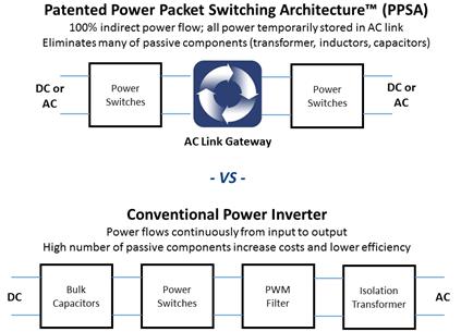 PPSA™ uses indirect power flow in which power flows through input switches and is temporarily stored in our proprietary AC link inductor. Our proprietary fast switching algorithms enable the transfer of quantum packets of power between ports in our system. As the AC link becomes charged, it disconnects from its input switches, resonates without being connected to either the input or output switches, and then reconnects to its output switches when it reaches the correct voltage and frequency for the application. PPSA™ is a power conversion technology that differentiates itself from traditional power conversion technology in key product metrics, such as size and weight while providing built-in isolation and bi-directional and multi-port capabilities. At December 31, 2017, we had been granted 38 US patents and five foreign patents related to PPSA™.