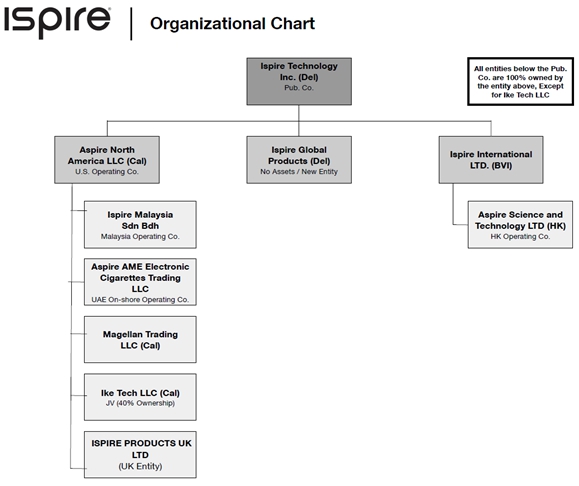 We are a Delaware corporation, incorporated on June 13, 2022. Aspire North America, LLC, a California limited liability company, was formed on February 22, 2020, and 100% of its ownership was transferred to Aspire Global on September 23, 2020, and was transferred by Aspire Global to Ispire Technology on July 29, 2022. Aspire Science, a Hong Kong corporation, was formed on December 9, 2016, as a subsidiary of Aspire Global, and 100% of its equity was transferred to our subsidiary, Ispire International, on July 29, 2022. Ispire International was organized on July 6, 2022. Ispire Malaysia Sdn Bhd was formed by on our behalf by Tuanfang Liu, our Chairman and Co-Chief Executive Officer, under the laws of the Federation of Malaysia on August 2, 2023, and assigned to us on September 22, 2023. Aspire North America and Aspire Science are our operating companies.