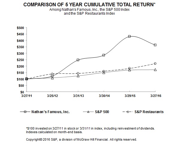 Through March 27, 2016, Nathan’s purchased a total of 5,096,757 shares of common stock at a cost of approximately $76,031 pursuant to the various stock repurchase plans previously authorized by the Board of Directors. Of these repurchased shares, 449,070 shares were repurchased at a cost of $19,231 during the year ended March 27, 2016, which includes 88,672 shares of common stock purchased pursuant to the modified Dutch Auction tender offer described above.