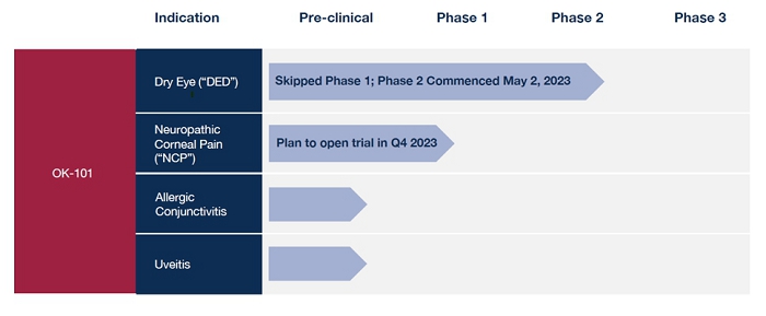 On June 6, 2023, the Company announced that patients are now being dosed in the randomized portion of the phase 2, multi-center, double-masked, placebo-controlled trial of topical ocular OK-101 to treat DED.