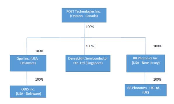 POET and its subsidiaries are developers of opto-electronic and photonic fabrication processes, devices and products. The company's vision is to enable the integration of photonics and electronics through both monolithic and hybrid approaches to design and packaging.  Integration is fundamental to increasing functional scaling and lowering the cost of current photonic solutions that drive applications in data communications, consumer products and industrial sensing.  Leveraging both Gallium Arsenide (GaAs) and Indium Phosphide (InP) technology platforms, POET believes that its advanced processes for active photonic devices and innovative passive components provide a unique and differentiated combination that will enable substantial improvements in component cost, size and performance over current photonic solutions.