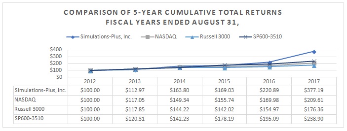 On June 1, 2017 the Company acquired DILIsym Service, Inc. As part of that agreement the Company paid $1,704,000 to former shareholders of DILIsym Services, Inc. who are currently employees of the Consolidated Company. In addition, as part of the acquisition agreement the Company owes approximately $1,980,000 of acquisition liabilities at August 31, 2017 to the former shareholders who are still employees of the Consolidated Company. One of the former shareholders of DILIsym is currently a director of Simulations Plus, under the agreement he received approximately, $29,000 and could receive up to approximately $34,000 in future earn-out payments.