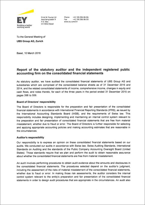 Cautionary StatementRegarding Forward-Looking Statements | This report contains statements that constitute “forward-looking statements,” including but not limited to management’s outlook for UBS’s financial performance and statements relating to the anticipated effect of transactions and strategic initiatives on UBS’s business and future development. While these forward-looking statements represent UBS’s judgments and expectations concerning the matters described, a number of risks, uncertainties and other important factors could cause actual developments and results to differ materially from UBS’s expectations. These factors include, but are not limited to: (i) the degree to which UBS is successful in executing its announced strategic plans, including its cost reduction and efficiency initiatives and its targets for risk-weighted assets (RWA) and leverage ratio denominator (LRD), and the degree to which UBS is successful in implementing changes to its wealth management businesses to meet changing market, regulatory and other conditions; (ii) the continuing low or negative interest rate environment, developments in the macroeconomic climate and in the markets in which UBS operates or to which it is exposed, including movements in securities prices or liquidity, credit spreads, and currency exchange rates, and the effect of economic conditions and market developments on the financial position or creditworthiness of UBS’s clients and counterparties; (iii) changes in the availability of capital and funding, including any changes in UBS’s credit spreads and ratings, as well as availability and cost of funding to meet requirements for debt that will be eligible for total loss-absorbing capacity (TLAC) requirements, or loss-absorbing capital; (iv) changes in or the implementation of financial legislation and regulation in Switzerland, the US, the UK and other financial centers that may impose, or result in, more stringent capital, TLAC, leverage ratio, liquidity and funding requirements, incremental tax requirements, additional levies, limitations on permitted activities, constraints on remuneration or other measures; (v) uncertainty as to when and to what degree the Swiss Financial Market Supervisory Authority (FINMA) will approve reductions to the incremental RWA resulting from the supplemental operational risk capital analysis mutually agreed to by UBS and FINMA, or will approve a limited reduction of capital or gone concern requirements due to measures to reduce resolvability risk; (vi) the degree to which UBS is successful in implementing changes to its legal structure to improve its resolvability and meet related regulatory requirements, including changes in legal structure and reporting required to implement US enhanced prudential standards, implementing a service company model, the transfer of the Asset Management business to a holding company, and the potential need to make further changes to the legal structure or booking model of UBS Group in response to legal and regulatory requirements relating to capital requirements, resolvability requirements and proposals in Switzerland and other countries for mandatory structural reform of banks and the extent to which such changes have the intended effects; (vii) changes in UBS’s competitive position, including whether differences in regulatory capital and other requirements among the major financial centers will adversely affect UBS’s ability to compete in certain lines of business; (viii) changes in the standards of conduct applicable to our businesses that may result from new regulation or new enforcement of existing standards, including measures to impose new or enhanced duties when interacting with customers or in the execution and handling of customer transactions; (ix) the liability to which UBS may be exposed, or possible constraints or sanctions that regulatory authorities might impose on UBS, due to litigation, contractual claims and regulatory investigations, including the potential for disqualification from certain businesses or loss of licenses or privileges as a result of regulatory or other governmental sanctions; (x) the effects on UBS’s cross-border banking business of tax or regulatory developments and of possible changes in UBS’s policies and practices relating to this business; (xi) UBS’s ability to retain and attract the employees necessary to generate revenues and to manage, support and control its businesses, which may be affected by competitive factors including differences in compensation practices; (xii) changes in accounting or tax standards or policies, and determinations or interpretations affecting the recognition of gain or loss, the valuation of goodwill, the recognition of deferred tax assets and other matters; (xiii) limitations on the effectiveness of UBS’s internal processes for risk management, risk control, measurement and modeling, and of financial models generally; (xiv) whether UBS will be successful in keeping pace with competitors in updating its technology, particularly in trading businesses; (xv) the occurrence of operational failures, such as fraud, misconduct, unauthorized trading, financial crime, cyber-attacks, and systems failures; (xvi) restrictions on the ability of UBS Group AG to make payments or distributions, including due to restrictions on the ability of its subsidiaries to make loans or distributions, directly or indirectly, or, in the case of financial difficulties, due to the exercise by FINMA of its broad statutory powers in relation to protective measures, restructuring and liquidation proceedings; (xvii) the degree to which changes in regulation, capital or legal structure, financial results or other factors, including methodology, assumptions and stress scenarios, may affect UBS’s ability to maintain its stated capital return objective; and (xviii) the effect that these or other factors or unanticipated events may have on our reputation and the a