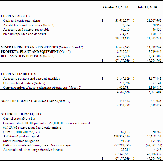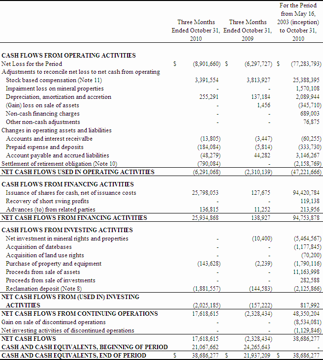 Net cash used in operating activities during the three months ended October 31, 2010 was $6,291,068 compared to $2,310,139 during the same period ended October 31, 2009. Significant operating expenditures during the current period included mineral property expenditures, general and administrative costs, management fees and professional fees. In addition, the Company spent $790,084 in settlement of asset retirement obligations.