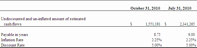 • Depreciation, amortization and accretion increased to $255,291 during the three months ended October 31, 2010 from $137,184 during the same period ended October 31, 2009, due primarily to additional charges on assets relating to the STMV Acquisition including accretion of asset retirement obligations.