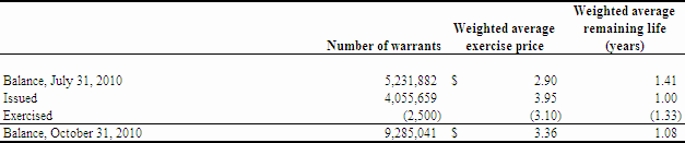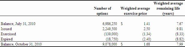 As at October 31, 2010, we had 9,078,000 stock options and 9,285,041 share purchase warrants outstanding. The outstanding stock options have a weighted average exercise price of $1.68 per share and the outstanding warrants have a weighted average exercise price of $3.36 per share. Accordingly, as at October 31, 2010, the outstanding options and warrants represented a total of 18,363,041 shares issuable for proceeds of approximately $46,448,778 if these options and warrants were exercised in full. The exercise of these options and warrants is at the discretion of the holders and, accordingly, there is no assurance that any of these options or warrants will be exercised.