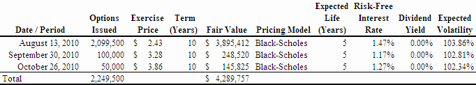 We follow ASC 718, Compensation - Stock Compensation, which addresses the accounting for stock-based payment transactions, requiring such transactions to be accounted for using the fair value method. We use the Black-Scholes option-pricing model to determine the grant date fair-value of stock-based awards under ASC 718. The fair value is recorded in income depending on the terms and conditions of the award and the nature of the relationship of the recipient of the award to us. We record the grant date fair value in income in line with the period over which it was earned. For employees and management this is typically considered to be the vesting period of the award. For consultants the fair value of the award is recorded in income over the term of the service period, and unvested amounts are revalued at each reporting period over the service period. We estimate the expected forfeitures and update the valuation accordingly.