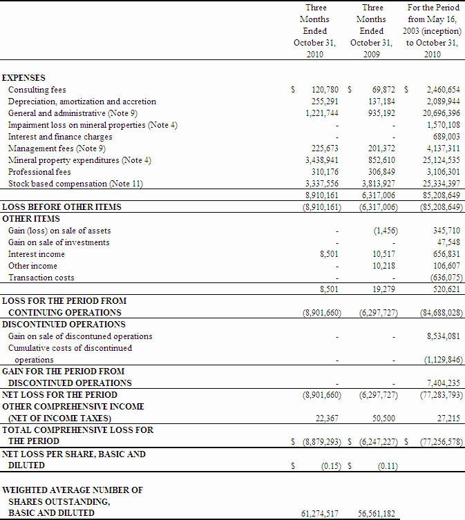 We commenced operations on May 16, 2003, and have not realized any significant revenues since inception. As at October 31, 2010, we have working capital of $34,784,257 and an accumulated deficit of $77,283,793. Existing cash resources are expected to provide sufficient funds through the upcoming year. The continuation of the Company as a going concern for greater than 12 months is dependent upon the ability of the Company to obtain necessary financing to continue operations. We are in the exploration stage of our mineral property development and to date have not yet established any known mineral reserves on any of our existing properties. Our continued operations and the recoverability of the carrying value of our assets are ultimately dependent upon our ability to achieve profitable operations. To date we have completed private placements and exercised stock options and warrants for net proceeds of $94,420,784 from the issuance of shares of our common stock.