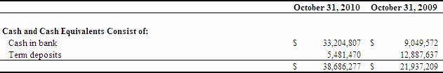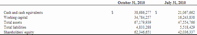 At October 31, 2010, we had $38,686,277 in cash and working capital of $34,784,257. Generally, we have financed our operations through proceeds from the private placement of equity securities and the exercise of stock options and warrants. We increased net cash by $17,618,615 during the three months ended October 31, 2010 compared to a decrease of $2,328,434 net cash during the same period ended October 31, 2009.