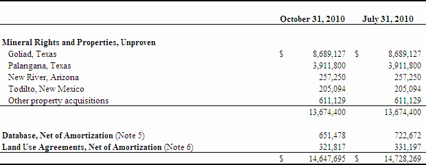 • Mineral property expenditures increased to $3,438,941 during the three months ended October 31, 2010 from $852,610 during the same period ended October 31, 2009 due to the commencement of exploration and development of the Palangana project which includes consultants relating to technical and geological work in addition to professional fees for ongoing permitting of the Goliad project.
