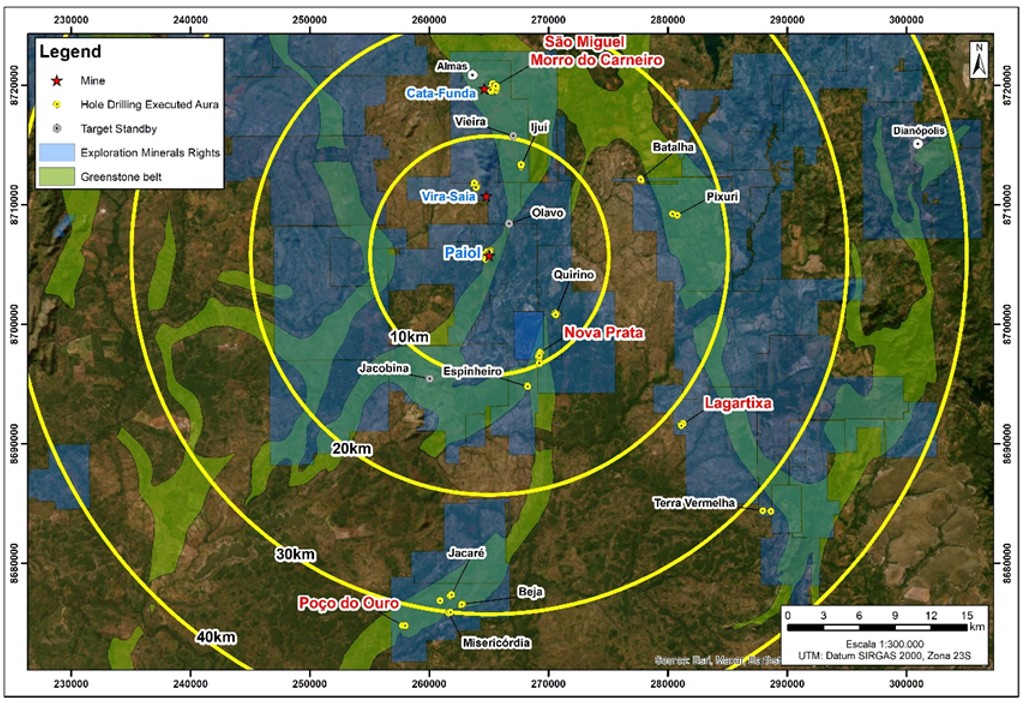 “Almas” or “Almas Mine” is our gold mine located in the state of Tocantins, Brazil. It comprises three deposits: Paiol, Vira Saia, and Cata Funda — along with several exploration targets such as Nova Prata/Espinheiro, Jacobina, and Morro do Carneiro, spread across a total area of 191,100 hectares of mineral rights.