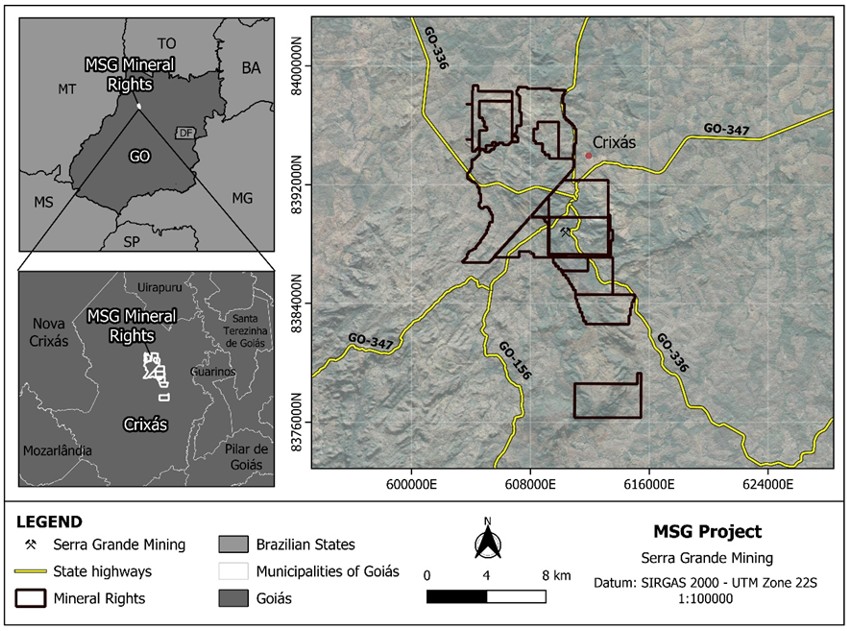 “MSG” or “Serra Grande” or “Serra Grande Mine” is a mining complex located in the northwest of the state of Goiás, central Brazil, near the city of Crixás which consists of three mechanized underground mines and an open pit, with one dedicated metallurgical plant with an annual capacity of 1.5 Mt.