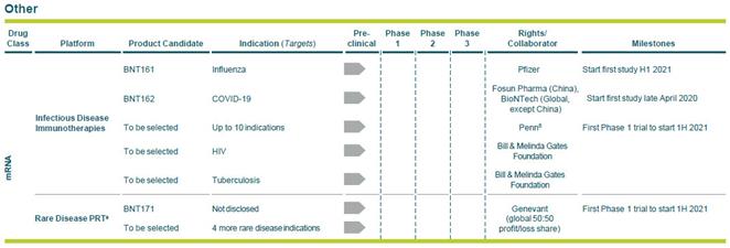 On March 16, 2020 BioNTech announced further details on the Company’s R&D effort, “Project Lightspeed”, to develop a potential vaccine to induce immunity and prevent COVID-19 infection in response to the growing global health threat posed by the disease. BioNTech’s product candidate, BNT162, is a potential first-in-class mRNA vaccine in the worldwide effort against COVID-19. BioNTech intends to initiate clinical testing for BNT162 in late April 2020, subject to regulatory approval, as part of a global clinical development program in Europe (commencing in Germany), the United States and China. The Company has been in close contact with regulatory and scientific authorities around the world and is in ongoing discussions with research organizations to make a vaccine available to the public as quickly as possible worldwide.