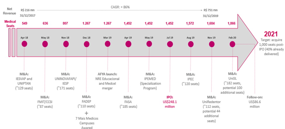On November 1, 2019, Afya Brazil entered into a purchase agreement for the acquisition of 100% of UniRedentor—Sociedade Universitária Redentor ("UniRedentor"). UniRedentor is a post-secondary education institution with governmental authorization to offer on-campus, undergraduate degrees and graduate programs in medicine and health, as well as other courses, in the State of Rio de Janeiro. The acquisition will contribute with 112 medical school seats, with a potential 44 additional medical school seats subject to the approval by MEC, and is in line with the Company’s strategy to focus on medical education, including medical school.