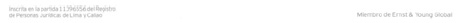 Ernst & Young es líder global en auditoría, impuestos, transacciones y servicios de asesoría. Cuenta con aproximadamente 500 profesionales en el Perú como parte de sus 130,000 profesionales alrededor del mundo, quienes comparten los mismos valores y un firme compromiso con la calidad.