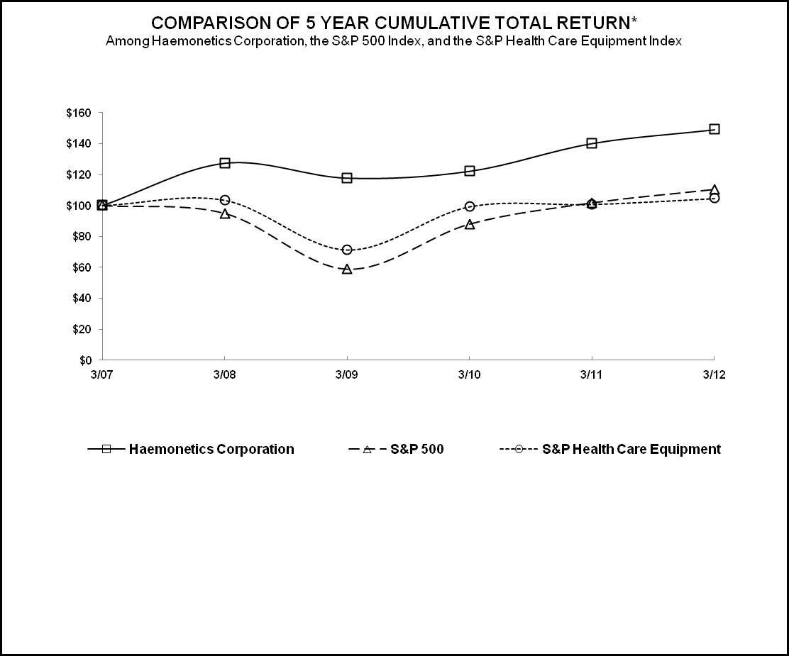 The following materials from Haemonetics Corporation on Form 10-K for the year ended March 31, 2012, formatted in Extensive Business Reporting Language (XBRL): (i) Consolidated Statements of Income, (ii) Consolidated Balance Sheets, (iii) Consolidated Statement of Stockholders’ Equity and Other Comprehensive Income, (iv) Consolidated Statements of Cash Flows, and (v) Notes to Consolidated Financial Statements, tagged as blocks of text.