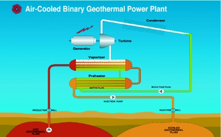 In a plant using a binary system, geothermal fluid, either hot water (also called brine) or steam or both, is extracted from the underground reservoir and flows from the wellhead through a gathering system of insulated steel pipelines to a heat exchanger, which heats a secondary working fluid which has a low boiling point. This is typically an organic fluid, such as isopentane or isobutene, which is vaporized and is used to drive the turbine. The organic fluid is then condensed in a condenser which may be cooled by air or by water from a cooling tower. The condensed fluid is then recycled back to the heat exchanger, closing the cycle within the sealed system. The cooled geothermal fluid is then reinjected back into the reservoir. The binary technology is depicted in the graphic below.