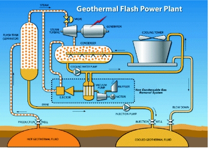 In a plant using flash design, geothermal fluid is extracted from the underground reservoir and flows from the wellhead through a gathering system of insulated steel pipelines to flash tanks and/or separators. There, the steam is separated from the brine and is sent to a demister in the plant, where any remaining water droplets are removed. This produces a stream of dry steam, which drives a turbine generator to produce electricity. In some cases, the brine at the outlet of the separator is flashed a second time (dual flash), providing additional steam at lower pressure used in the low pressure section steam turbine to produce additional electricity. Steam exhausted from the steam turbine is condensed in a surface or direct contact condenser cooled by cold water from a cooling tower. The non-condensable gases (such as carbon dioxide) are removed through the removal system in order to optimize the performance of the steam turbines. The condensate is used to provide make-up water for the cooling tower. The hot brine remaining after separation of steam is injected back into the geothermal resource through a series of injection wells. The flash technology is depicted in the graphic below.