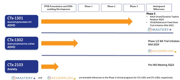 Advance development of CTx-1302 for the treatment of ADHD. We plan to initiate a Phase 1/2 bioavailability study in ADHD patients for CTx-1302 in the mid-2024 and, if the results from this study are successful, subsequently initiate pivotal Phase 3 clinical trials in all patient segments for CTx-1302 in late 2024 or early 2025.