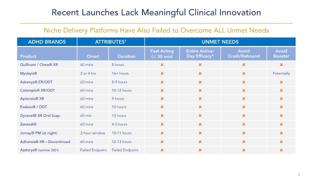 In recent years, the FDA has approved additional stimulant medications that were designed to meet some of the remaining unmet needs. Chewables, liquids and oral disintegrating tablets have come to market as has one product with an evening dosing schedule intended to provide early morning onset. None of these products have been able to meet all of the unmet needs of ADHD patients and prescribers and consequently all have failed to gain traction as first-line agents. Furthermore, these recent stimulant medications, based on their market share, appear to offer little advantage over widely available generic products for healthcare practitioners and their patients. They have proven to be niche remedies occupying a combined 2.0% of the total ADHD prescriptions written in the United States in 2020. Thus, there is an unmet need for a true once-daily dose providing a fast onset of action, minimization or elimination of the crash/rebound, elimination of the booster/recovery dose, and most importantly, providing entire active-day efficacy.