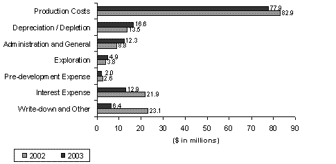 Total cash costs for 2004 increased to $5.46 per ounce compared to $4.66 per ounce in 2003. The higher cash costs are the result of lower-grade ore and the conversion to higher-cost mining methods needed to accommodate ground conditions in certain mining areas during 2004. Also contributing to the higher costs were increased development and mine repair in connection with the ongoing optimization plan.
