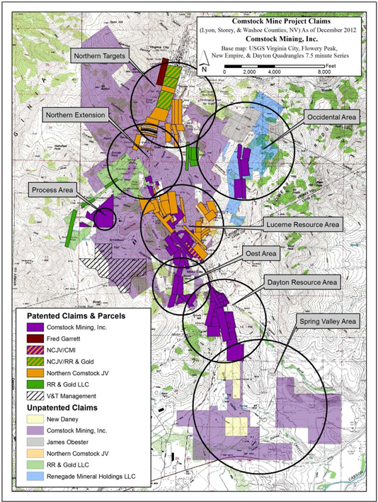 The Spring Valley exploration target lies at the southern end of the Comstock District, where the mineralized structures lie mostly concealed beneath a veneer of sediment gravels. The area includes the Kossuth claim south of State Route 341, the Dondero property, the New Daney lode mining claims, and the Company’s placer mining claims in Spring Valley and Gold Canyon.