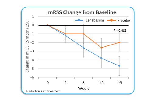 The modified Rodnan Skin Score (mRSS), the primary outcome for the Phase 3 study of lenabasum in SSc, improved by a mean (SD) of -8.4 in the 32 subjects who had completed 28 weeks open-label dosing at the time of data analyses, compared to baseline at the start of the Phase 2 double-blind placebo-controlled portion of the study. 75% of 36 subjects who received open-label dosing with lenabasum achieved a degree of improvement in mRSS (reduction ≥ 5 points and > 25% baseline) from the study start that has been previously associated with improved survival in SSc. A third of subjects reached a mRSS ≤ 10 points and 22% achieved a mRSS score <5 points.