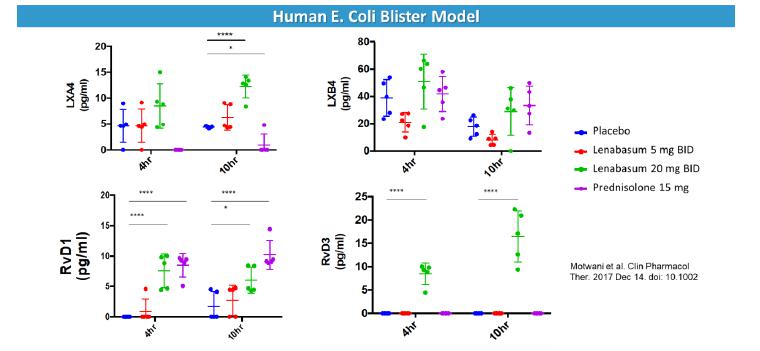 Dr. Derek Gilroy, Professor of Experimental Inflammation and Pharmacology at University College of London evaluated the effects of lenabasum in a clinical research model of inflammation and its resolution in healthy volunteers. In this model, inflammation was triggered in healthy individuals by the subcutaneous injection of heat-killed E. coli. Blood flow to the site of inflammation was measured with laser Doppler techniques. Suction blisters were generated over the site of inflammation, and cells and inflammatory mediators were measured in the blister fluid at different times after the injection of E. coli. In this study twenty two subjects received either lenabasum at 5 mg or 20 mg twice a day or placebo prior to the procedure.
