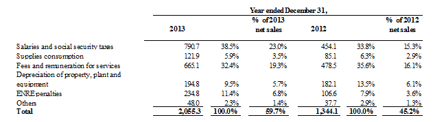 In accordance with the decision of the board of directors to divest and sell the subsidiary Aeseba as of March 31, 2013 and the subsidiaries Emdersa Holding S.A. (Emdersa Holdingˮ or “EHSA”), including Emdersa and its subsidiaries, Empresa Distribuidora de San Luis S.A. (“Edesal”), Empresa Distribuidora de La Rioja S.A. (“Edelar”), Empresa Distribuidora de Salta S.A. (“Edesa”) and Emdersa Generación Salta S.A. (“EGSSA”), as of December 31, 2011, we have classified the corresponding assets and liabilities associated to these subsidiaries in the consolidated financial statements as of December 31, 2012 and 2011 as “Assets of disposal groups classified as held for sale” and “Liabilities of disposal groups classified as held for sale”. As of October 11, 2011, October 25, 2011 and May 10, 2012 the Company sold its direct and indirect stake in EGSSA, Edesal and Edesa, respectively. The corresponding charges to results have been included within “Loss (profit) from discontinued operations” line item in our consolidated statements of comprehensive loss for the years ended December 31, 2012 and 2011. As of April 5, 2013, the Company sold its stake in Aeseba. The corresponding charges to results have been included within “Loss from Discontinued operations” line item in our consolidated statements of comprehensive loss for the year ended December 31, 2013.