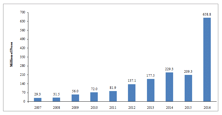 As of December 31, 2015, the Company recognized as facilities in service in the Property, plant and equipment account its participation in the works for an estimated value of $ 141.8 million, including financial charges. As of December 31, 2016 and 2015, the contribution of $ 173 million and $ 155.8 million, respectively, was pending, a debt which is disclosed in the Other payables account of non-current liabilities.