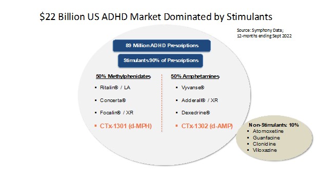 We are targeting the ADHD stimulant-based treatment market, with an estimated US market size of $18 billion as of the September 2022. Stimulants are the most commonly prescribed class of medications for ADHD and account for more than 90% of all ADHD medication prescriptions in the United States, where approximately 80 million stimulant prescriptions were written during the 12-months ended September 2022. By contrast, non-stimulant medications are typically employed only in the second-line or adjunctive therapy setting and account for 10% of all ADHD medication prescriptions. Extended-release, or long-acting, dosage forms of stimulant medications are most frequently deployed as the first-line treatment for ADHD and constitute approximately 59% of ADHD stimulant prescriptions by volume and nearly 83% of the dollars. Most of these extended-release dosage forms are approved for once-daily dosing in the morning and were designed to eliminate the need for re-dosing during the day. However, with the current ‘once-daily’ extended-release dosage forms, most patients still receive a second or “booster” dose for administration later in the day (typically in the early afternoon) to achieve entire active-day coverage and suffer from a multitude of unwanted side effects as a result. We believe there is a significant, unmet need within the current treatment paradigm for true once-daily ADHD stimulant medications with lasting duration and superior side effect profiles to better serve the needs of patients throughout their entire active-day.