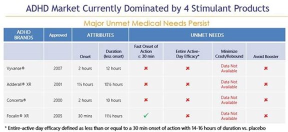 Lower Abuse Potential. We believe our fast onset and entire active-day solution for ADHD patients, if approved, will lower the incidence of short-acting stimulant drug abuse and diversion. We believe by eliminating the need for the short-acting stimulant booster dose, the potential for illicit sales and recreational use that often comes as a result of patients carrying short-acting Schedule II controlled substances to school or work for afternoon dosing will decrease.