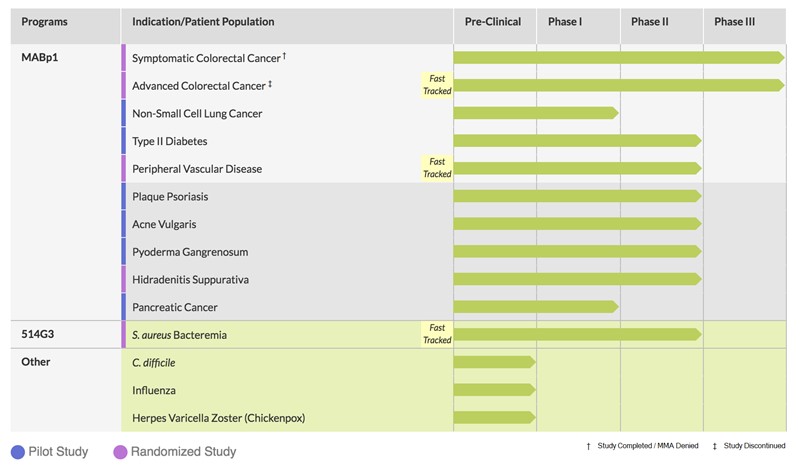 An investigator sponsored study was launched in September 2017 at Cedars Sinai Medical Center located in Los Angeles, California for MABp1 to be used in combination with OnivydeⓇ (Irinotecan liposome injection) and 5-fluorouracil/folinic acid for treatment of advanced pancreatic adenocarcinoma. Andrew Hendifar, M.D., Principal Investigator of the study, Medical Oncology lead for the Gastrointestinal Disease Research Group at Cedars-Sinai and Co-Director of Pancreas Oncology, will be leading the study which is planned to enroll a total of 16 patients at the Cedars-Sinai Medical Center. The Phase I study will determine a maximum tolerated dose as well as assess efficacy. Other studies with MABp1 in oncology are also being considered and these will be announced if and when further progress is made in these directions.