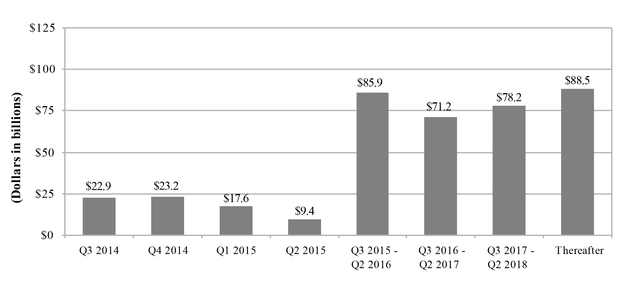 An additional reduction in our credit ratings may also trigger additional collateral requirements under our derivative contracts because a majority of our OTC derivative contracts contain provisions that require our senior unsecured debt to maintain a minimum credit rating from S&P and Moody’s. If our senior unsecured debt credit ratings were downgraded to established thresholds in our OTC derivative contracts, which range from A+ to BBB+, we could be required to provide additional collateral to or terminate transactions with certain counterparties. The aggregate fair value of all OTC derivatives with credit-risk-related contingent features that were in a net liability position as of June 30, 2013 was