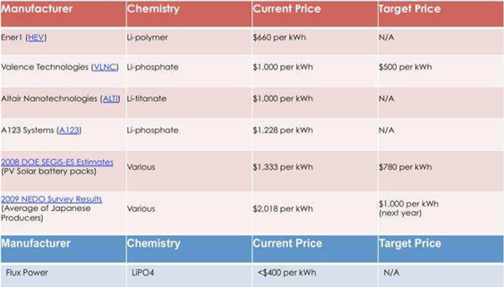 Lowest Cost:Advanced energy storage systems provide power dense solutions with extended cycle life which, together, equate to very cost conscious solutions for most applications in the electric vehicle and grid management market segments. We believe that, in our products, advanced energy storage systems can cost much less than legacy lead acid technologies over the course of device operation.
