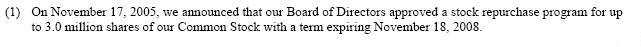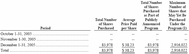 Repurchase of Common Stock — On July 25, 2002, the Company announced that its Board of Directors approved a stock repurchase program for up to 3.0 million shares of common stock (the “2002 Repurchase Plan”). During the third quarter of 2005, the Company completed the repurchase of the shares authorized under the 2002 Repurchase Plan. On November 17, 2005, the Company announced that its Board of Directors approved a stock repurchase program for up to 3.0 million shares of common stock (the “2005 Repurchase Plan”). For the year ended December 31, 2005, the Company repurchased approximately 1.7 million shares of common stock under both the 2002 Repurchase Plan and the 2005 Repurchase Plan for $52.3 million, or $30.92 per share.