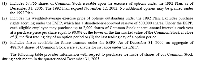 Employee Stock Purchase Plan — The Company implemented an employee stock purchase plan effective May 26, 2005 (the “ESPP”) at which time participating employees became entitled to purchase common stock through payroll deduction of up to 10.0% of the employee’s annual compensation. Under the ESPP, each eligible employee may purchase up to 2,000 shares of common stock at semi-annual intervals each year at an issue price equal to the lesser of (1) 90.0% of market price on the first trading day of the semi-annual option period or (2) 90.0% of market price on the last trading day of the semi-annual option period. The Company has reserved 500,000 shares of common stock for issuance pursuant to the ESPP. At December 31, 2005, 11,496 shares had been issued under the ESPP.