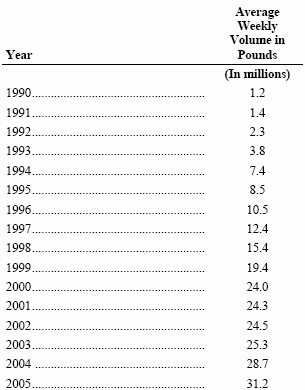 The average weekly volume of freight moving through our network was over 31.2 million pounds per week in 2005, an increase of 8.7% versus 2004. During 2005, our average shipment weighed over 750 pounds and shipment sizes ranged from small boxes weighing only a few pounds to large shipments of several thousand pounds. Although we impose no significant size or weight restrictions, we focus our marketing and price structure on shipments of 200 pounds or more. As a result, we do not typically directly compete with integrated air cargo carriers in the overnight delivery of small parcels. The table below summarizes the average weekly volume of freight moving through our network for each year since 1990.
