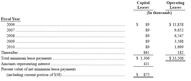 Future minimum rental payments under capital leases and noncancellable operating leases with initial or remaining terms in excess of one year consisted of the following at December 31, 2005: