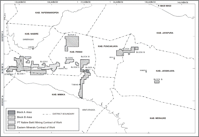 Under another joint venture agreement through PT Nabire Bakti Mining, we conduct exploration activities (currently suspended) in an area covering approximately 0.5 million acres in five parcels contiguous to PT Freeport Indonesia's Block B and one of Eastern Minerals' blocks.
