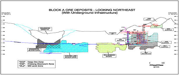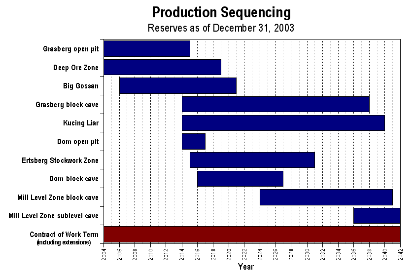 At December 31, 2003, PT Freeport Indonesia's share of proven and probable recoverable reserves totaled 39.7 billion pounds of copper and 46.6 million ounces of gold, all of which are located in Block A. Our approximate 90.64 percent equity share of those proven and probable recoverable reserves totaled 36.0 billion pounds of copper and 42.2 million ounces of gold (see Ore Reserves). In this annual report, we refer to (1) aggregate reserves, which means all reserves for the operations we manage, (2) PT Freeport Indonesia's share of reserves, which means the reserves net of Rio Tinto's interest under our joint venture arrangements and which are the reserves reported as those of our operations in our consolidated financial statements and (3) our equity share of reserves, which means PT Freeport Indonesia's share net of the 9.36 percent interest that the Government of Indonesia owns.