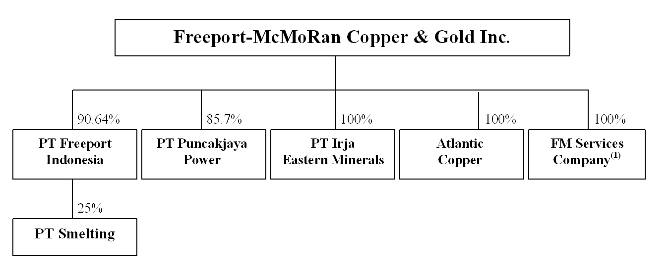 Our principal operating subsidiary is PT Freeport Indonesia, a limited liability company organized under the laws of the Republic of Indonesia and incorporated as a corporation in Delaware. We own approximately 90.64 percent of PT Freeport Indonesia, and the Government of Indonesia owns the remaining approximate 9.36 percent. PT Freeport Indonesia mines, processes and explores for ore containing copper, gold and silver. It operates in the remote highlands of the Sudirman Mountain Range in the province of Papua, Indonesia, which is on the western half of the island of New Guinea. PT Freeport Indonesia markets its concentrates containing copper, gold and silver worldwide.